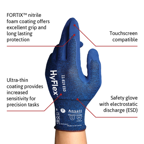 Advanced tactility: HyFlex 11-819 ESD industrial gloves also possess superior tactile sensitivity and touchscreen compatibility.